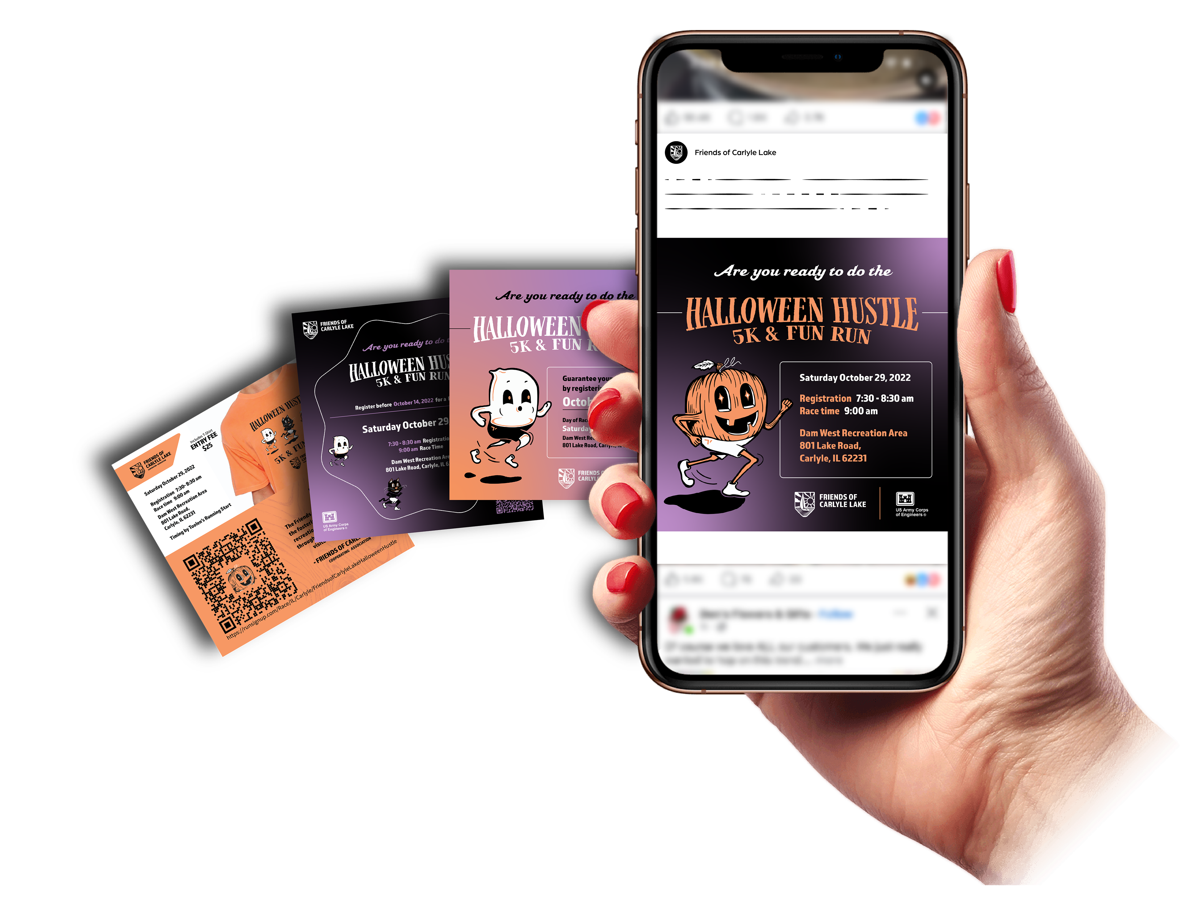 Custom illustrations were created of a few fun halloween themed characters to align with younger audiences and families near the community.